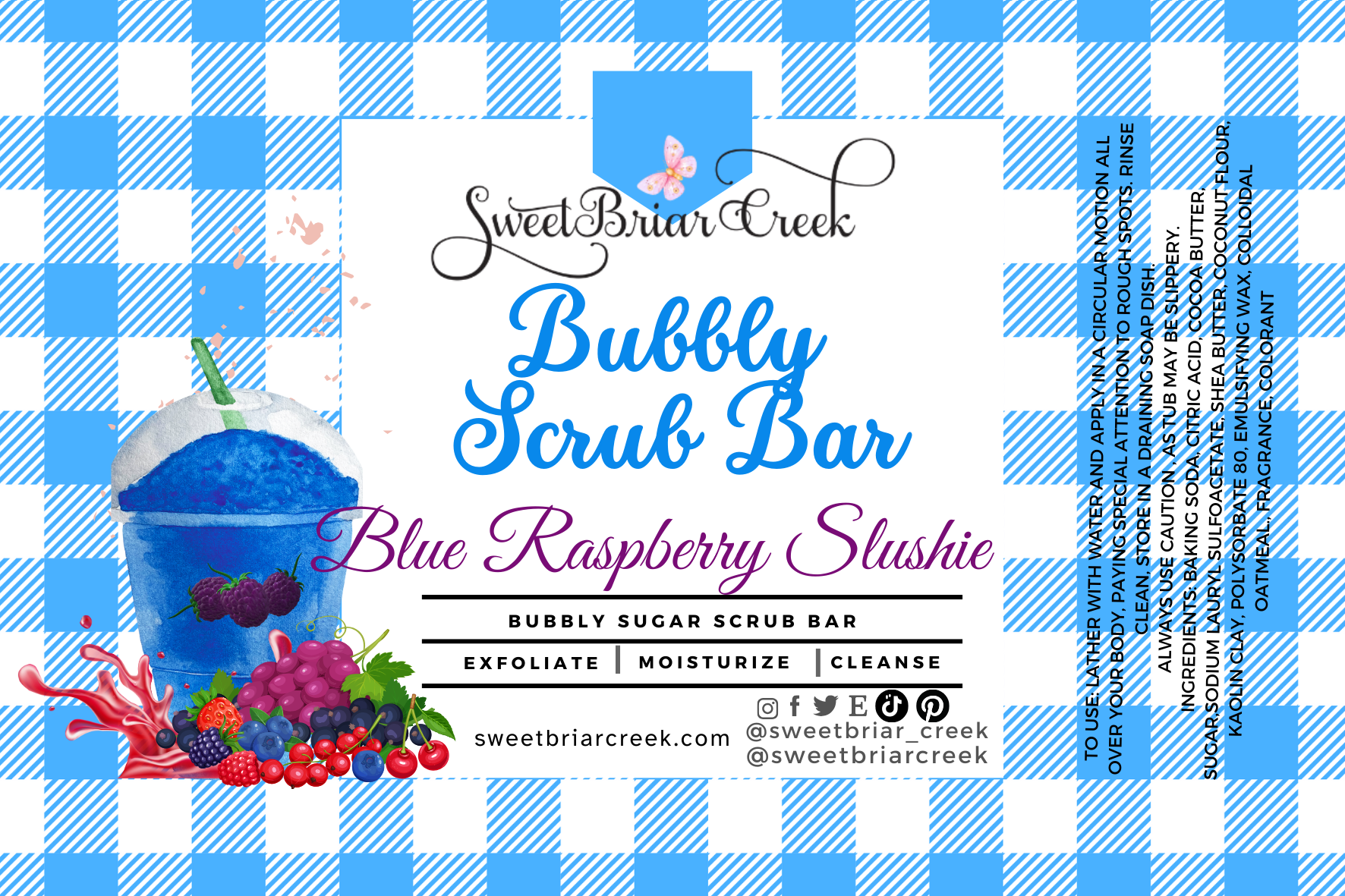 Ingredients: Baking Soda, Citric Acid, Cocoa Butter, Sugar,Sodium Lauryl Sulfoacetate, Shea Butter, Coconut Flour, Kaolin Clay, Polysorbate 80, Emulsifying wax, Colloidal oatmeal.