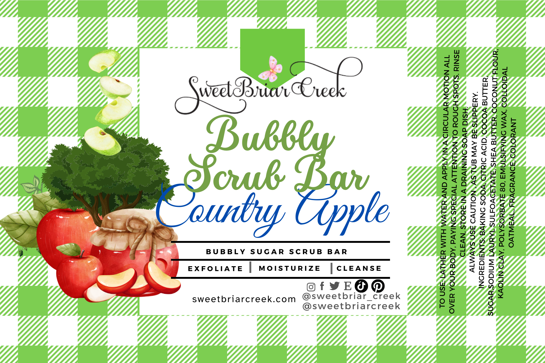 Ingredients: Baking Soda, Citric Acid, Cocoa Butter, Sugar,Sodium Lauryl Sulfoacetate, Shea Butter, Coconut Flour, Kaolin Clay, Polysorbate 80, Emulsifying wax, Colloidal oatmeal.