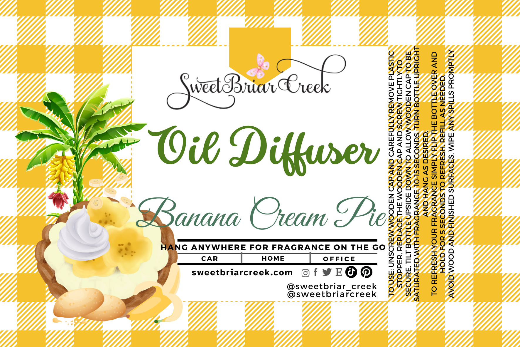 To Use: Unscrew wooden cap and carefully remove plastic stopper. Replace the wooden car and screw tightly to secure. Tilt bottle upside down to allow wooden cap to be saturated with fragrance, 10-15 seconds. Turn bottle upright and hang as desired.