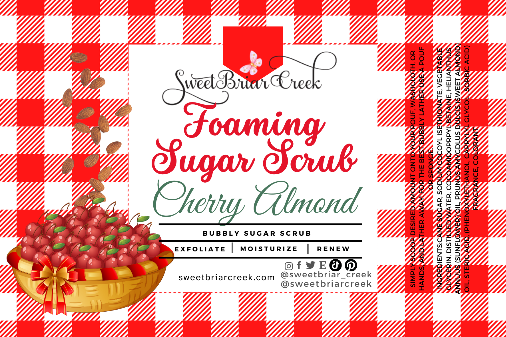 Ingredients:Cane Sugar, Sodium Cocoyl Isethionate, Vegetable Glycerin, Distilled Water, Cocoamidoprpyl Betaine, Helianthus Annuus (Sunflower) Oil, Prunus Amygdlus Dulcis (Sweet Almond) Oil, Steric Acid, (Phenoxylethanol, Caprylyl Glycol , Sorbic Acid) Fragrance, Colorant