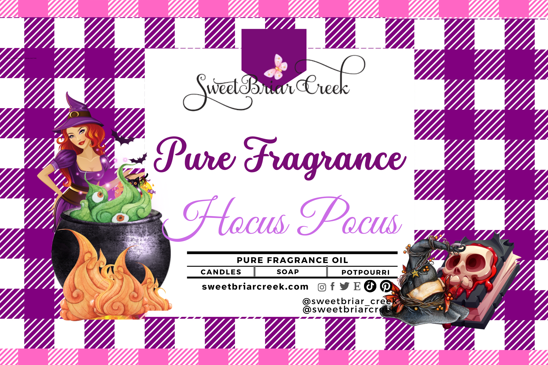 Hocus Pocus-A true work of art fragrance beginning with top notes of fresh pear, blueberries, and pineapple; followed by middle notes of juniper berries and eucalyptus; and well rounded with base notes of spruce, woods, Douglas fir, cedar, and white musk.