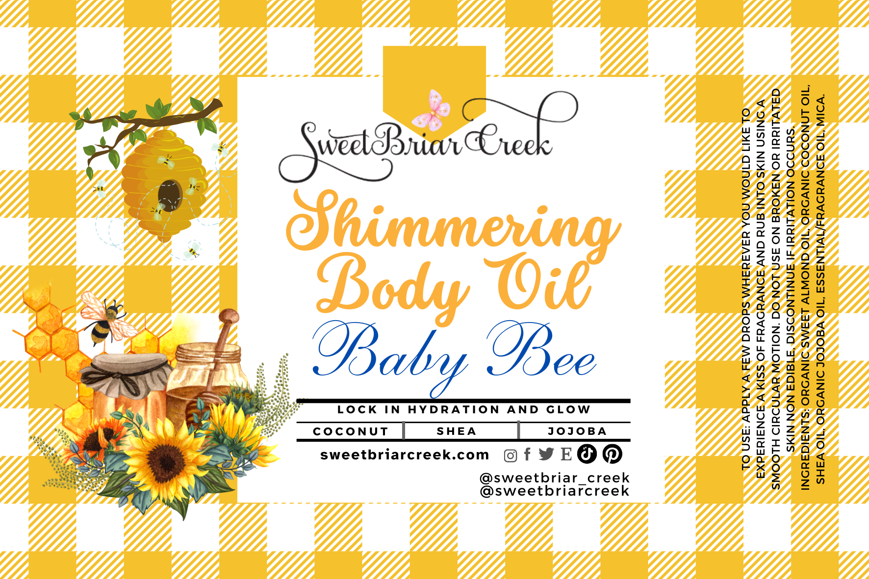 Ingredients: Organic sweet Almond Oil, Organic Coconut Oil, Shea Oil, Organic Jojoba Oil, Essential/Fragrance oil, Mica.