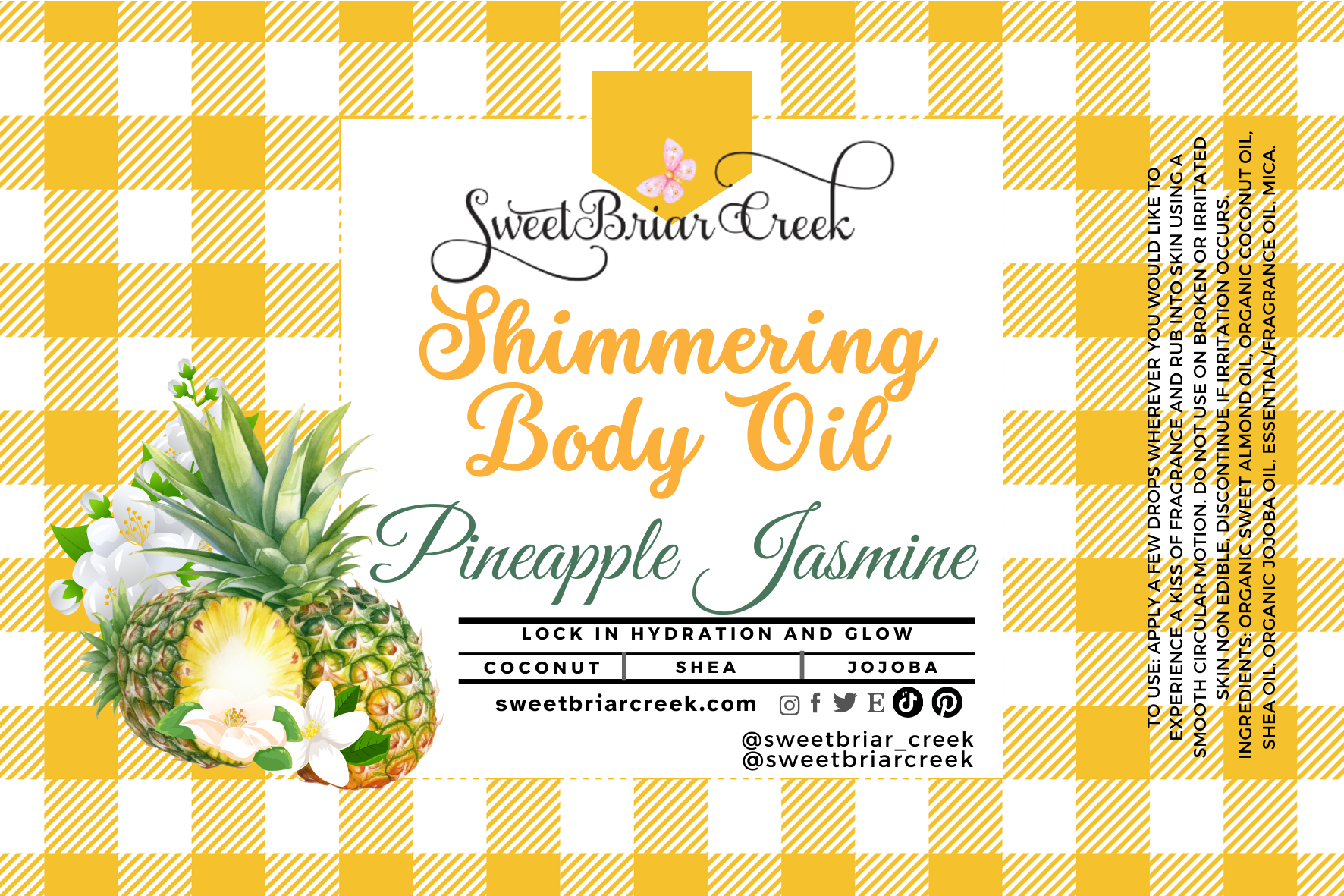 Ingredients: Organic sweet Almond Oil, Organic Coconut Oil, Shea Oil, Organic Jojoba Oil, Essential/Fragrance oil, Mica.